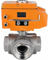 Кран шаровой DN.ru BV3232P(4pc)-SP-3WL-T-ISO-H Ду40 Ру63 стандартнопроходной L-тип, трехходовой, нержавеющая сталь SS316, внутренняя резьба, уплотнение - PTFE, с эл. приводом DN.ru E34-N-005EM-O1-220VAC-У1 с сертификатами качества. Доставка. Гарантия. В наличии! Звоните!