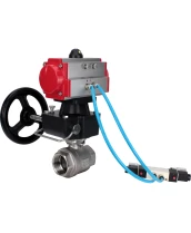 Кран шаровой DN.ru BV3232P(2pc)-FP-T-ISO-H Ду10 Ру63, полнопроходной внутреннняя резьба, нержавеющая сталь SS316, уплотнение - PTFE, с пневмоприводом PA-DA-052, с пневмораспределителем 4V320-08 220В, с ручным дублером MON1-250-T26-ISO